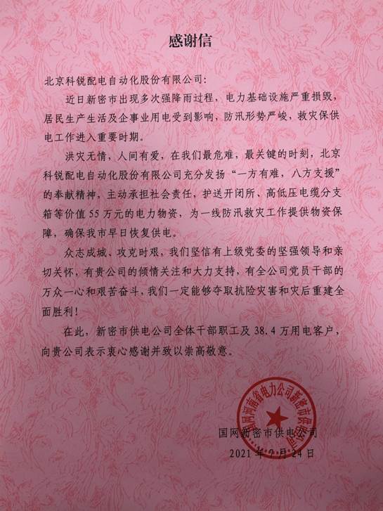 長期以來,北京科銳跟國家電網一直有著密切的合作。國家電網成就了北京科銳的發展壯大,北京科銳也在國家電網建設做出了應有的貢獻。災情面前,北京科銳挺身而出是義不容辭的社會責任擔當,也是每一位科銳人的愛心奉獻。